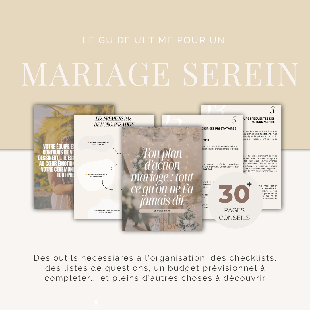Accède maintenant àl’ebook pratique qui t’aide à organiser ton mariage en toute sérénité – ou choisis la version avec coaching pour un vrai coup de boost personnalisé !